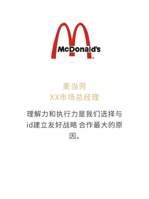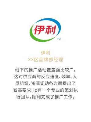 i-d先后經(jīng)歷與Audi、Mercedes-Benz、infiniti、PORSCHE、可口可樂(lè)、麥當(dāng)勞、肯德基、Budweiser、華為、小米、中國(guó)移動(dòng)、ELLE、L'OREAL、萬(wàn)達(dá)、仁恒置地、恒大、碧桂園、蘭桂坊...的業(yè)務(wù)合作,成功地將國(guó)際化的營(yíng)銷策劃理念及執(zhí)行方式融入本土,為更多的中國(guó)企業(yè)開啟全新的品牌推廣思路和執(zhí)行方案。